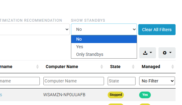On the Workspaces page, the table can be filtered to hide or show standby workspaces.