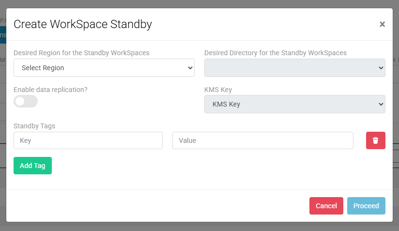 After enabling the standby creation, select a standby region and directory. If the primary WorkSpace has a encryption key attached, then the standby also needs a CMK or multi-region key Prerequisites